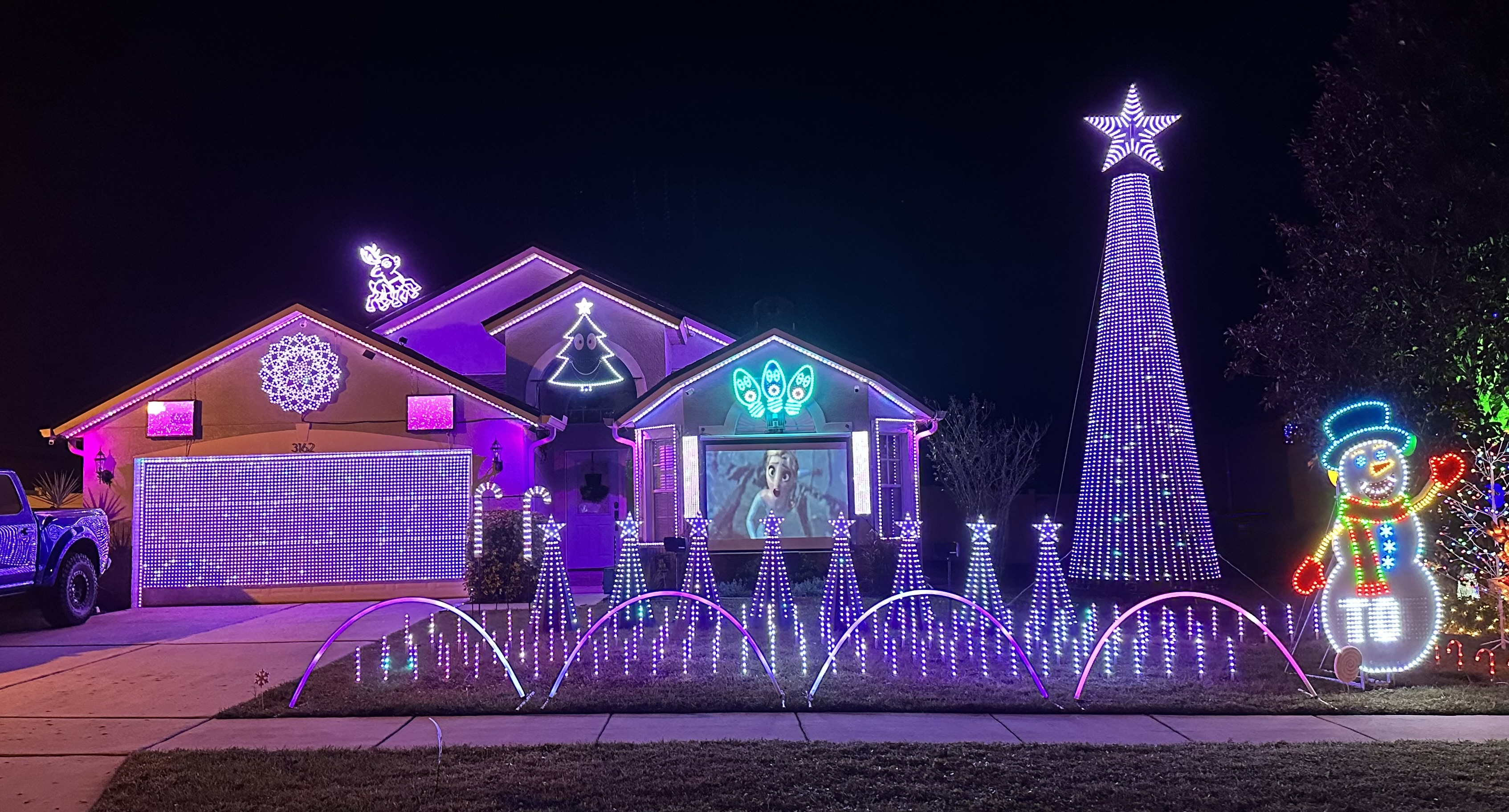 This is pixel light show with over 12k pixels and a projector. There is a snow and fog machine added this year. Show runs from 7-9 every night in December.