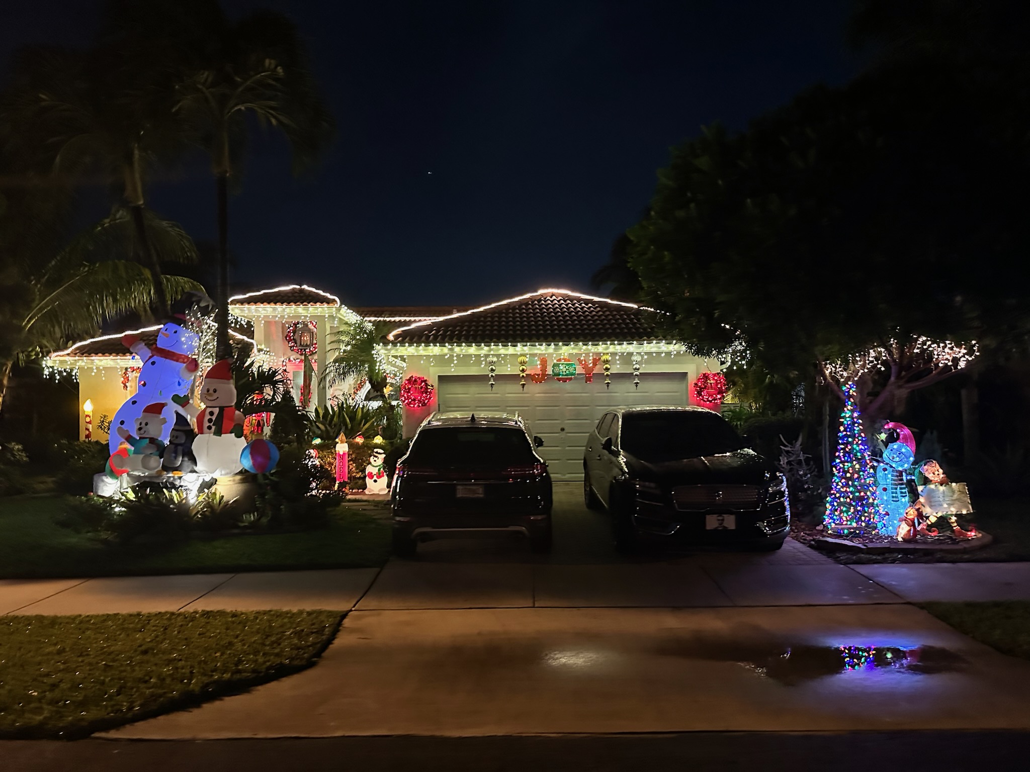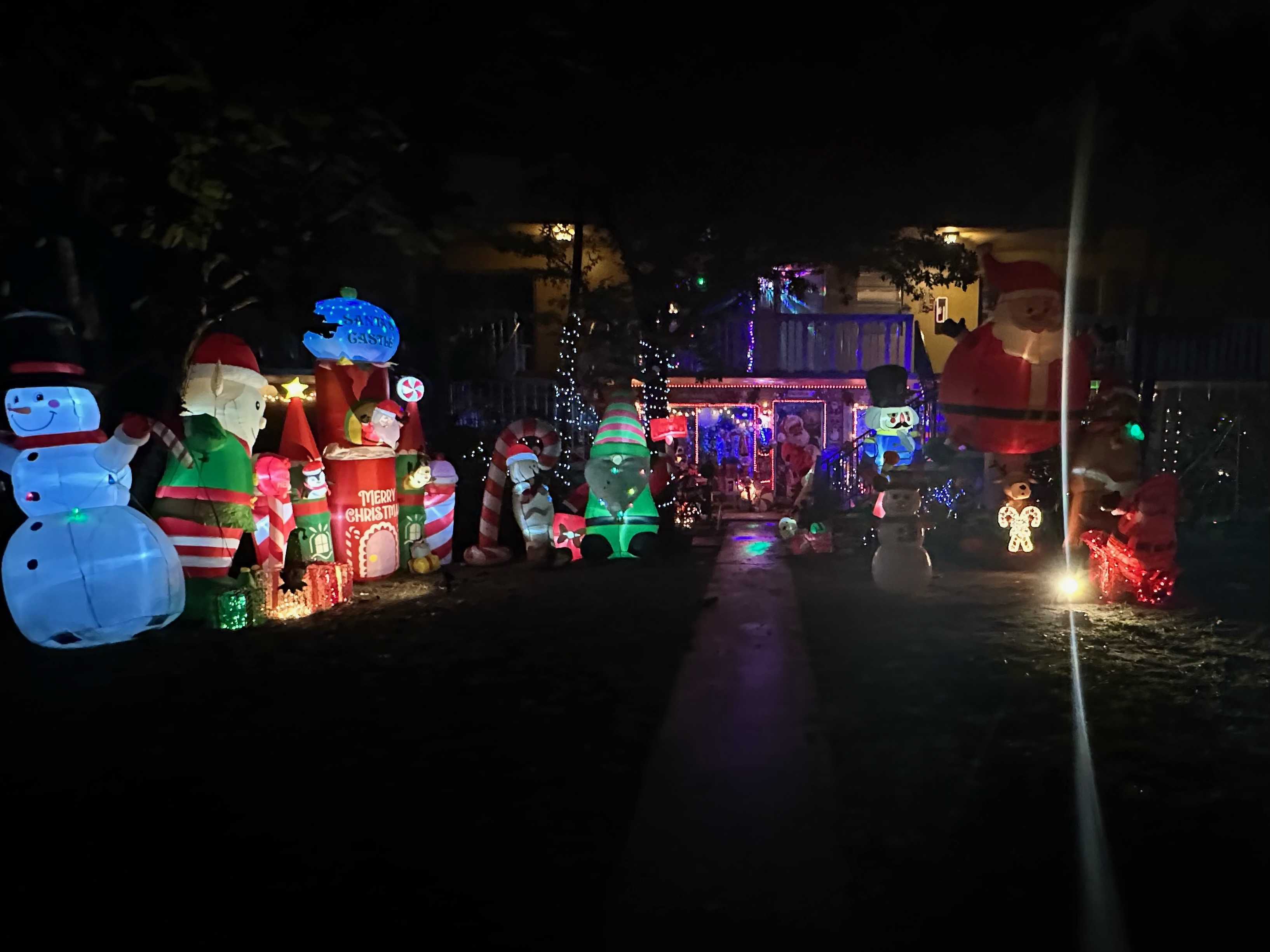 Lots of lights with a mixture of carefully curated lights inflatables and unique features including a life size grinch on the roof stealing lights.