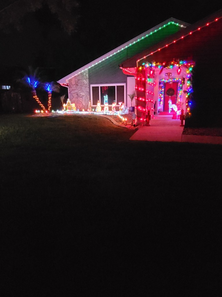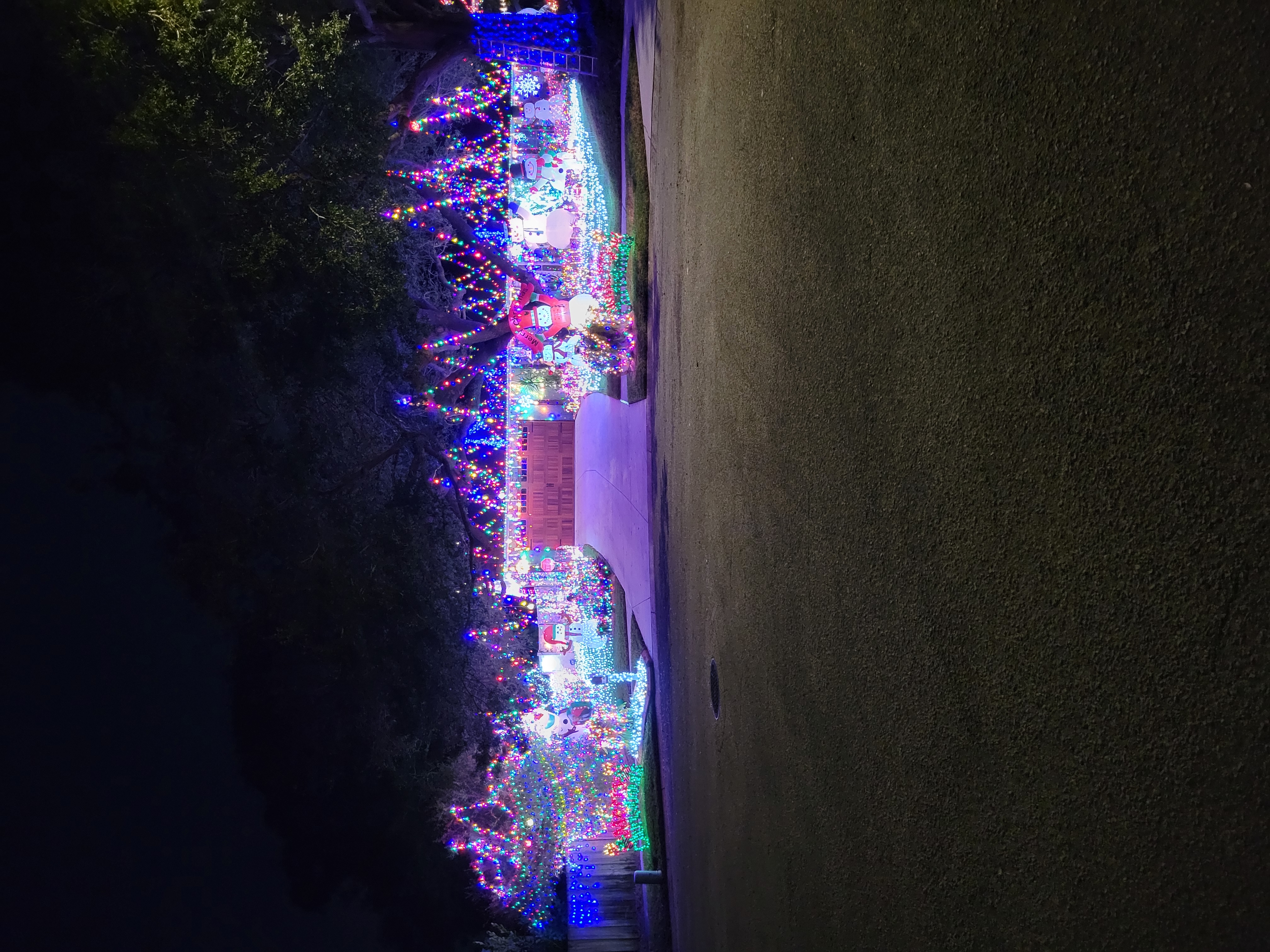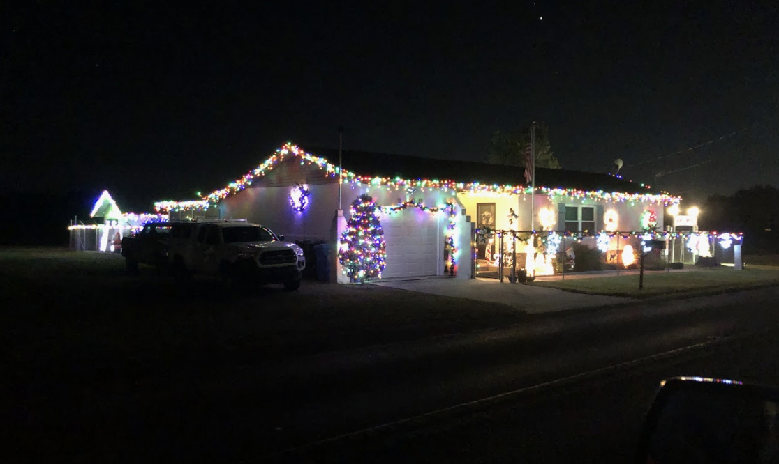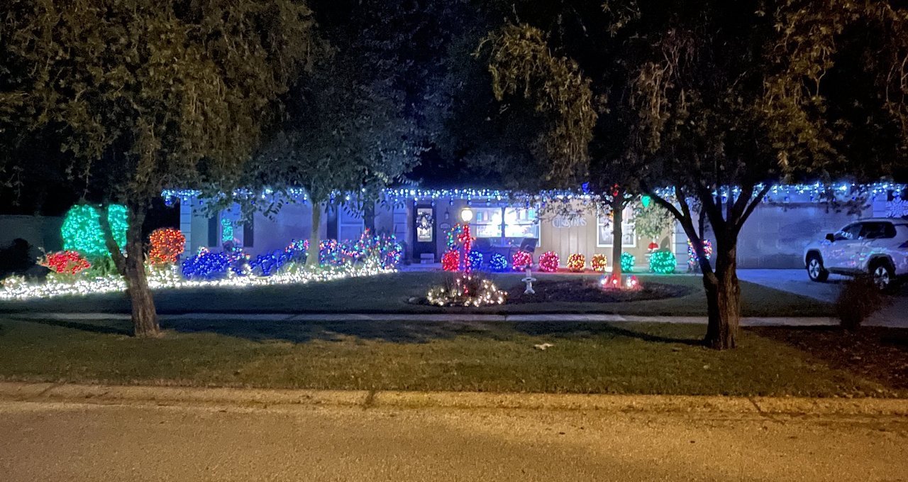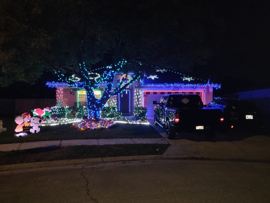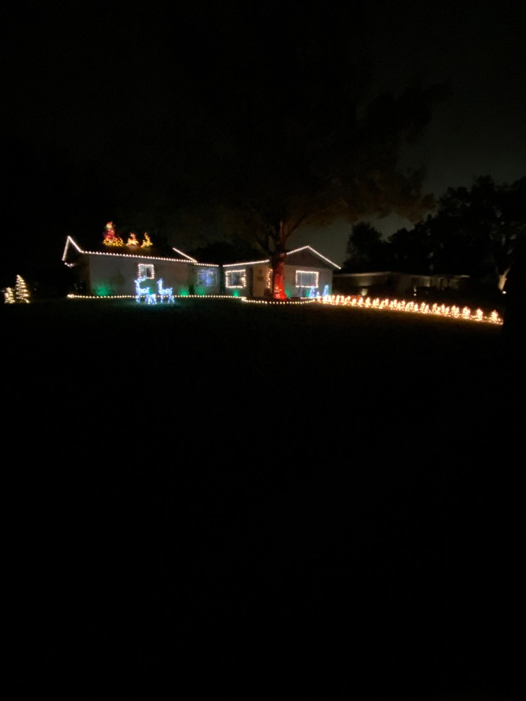 This picture was taken while moving with a line of cars behind us, so it doesn’t do the home justice. It is a full-property display with a roof blanketed in welcoming lights. There is a lovely forest of trees covering the front yard.