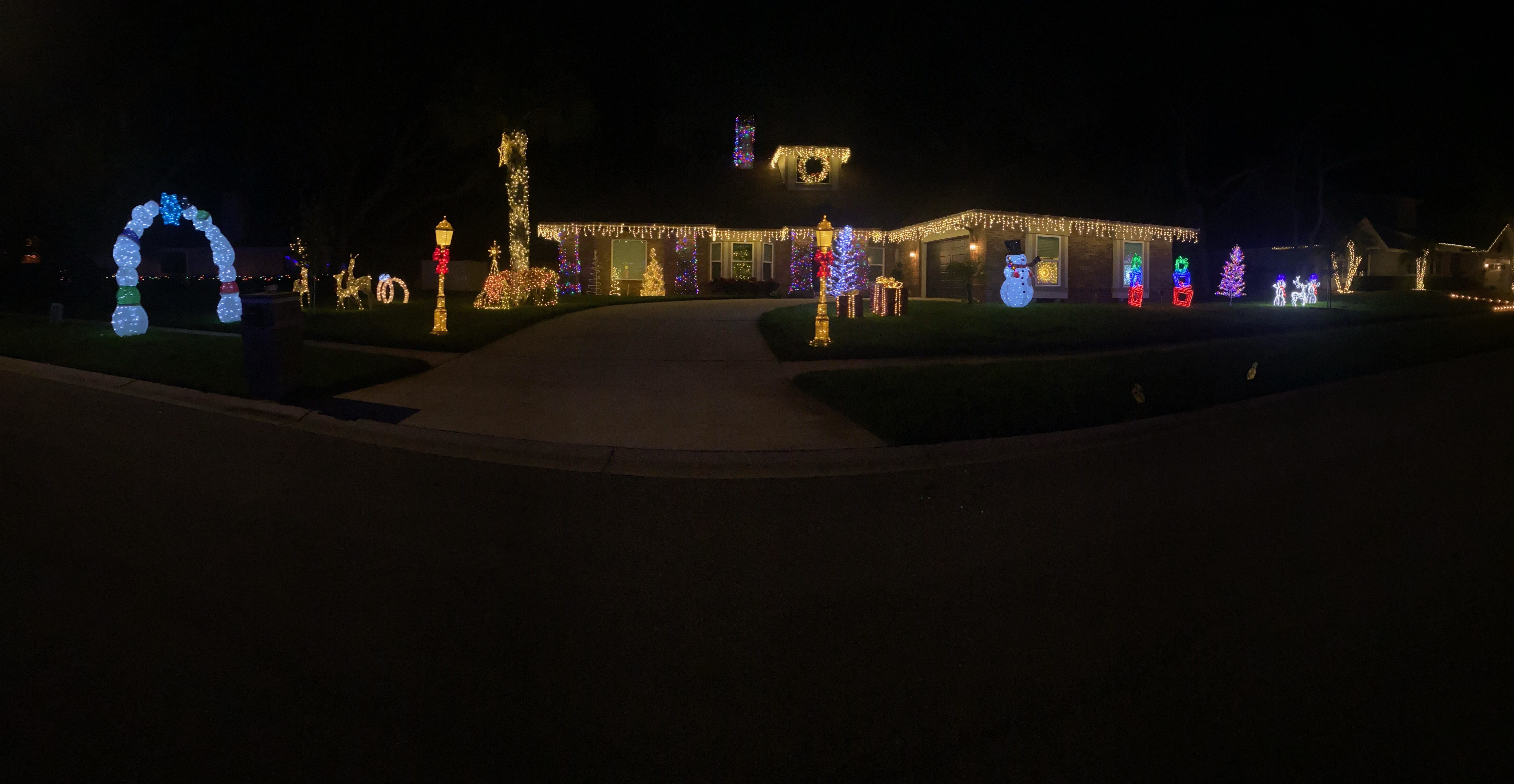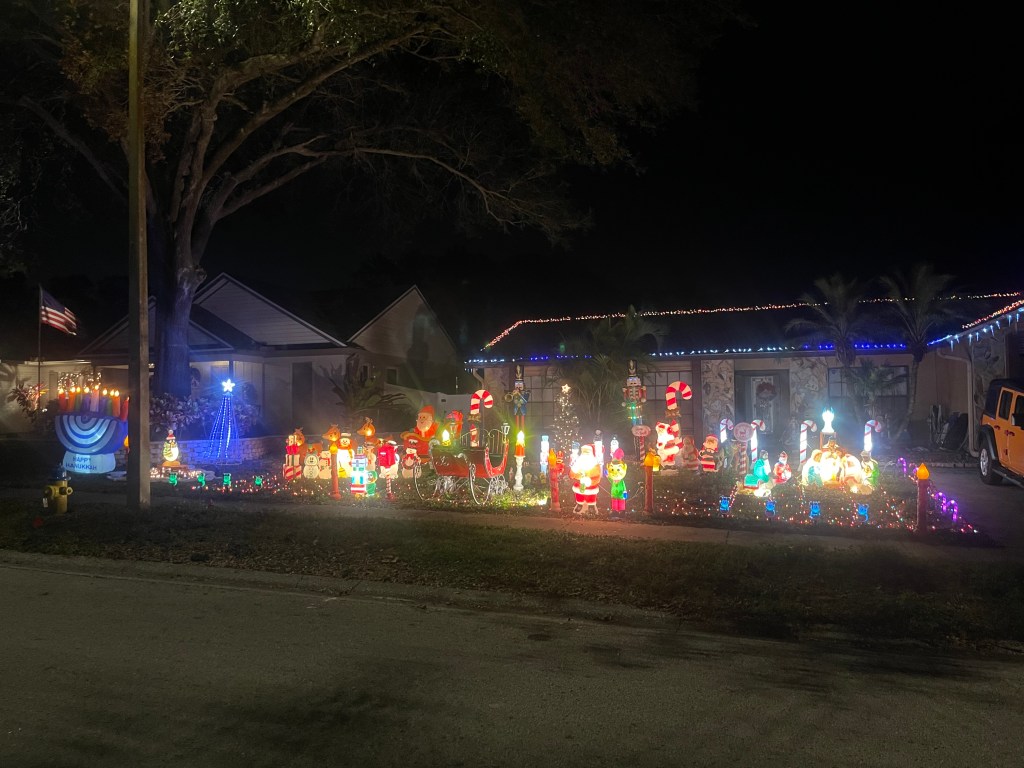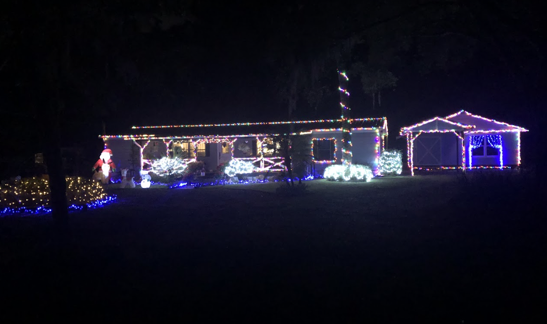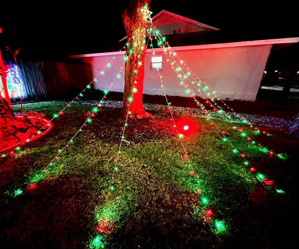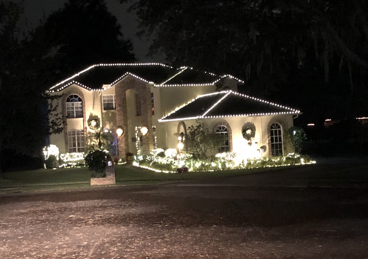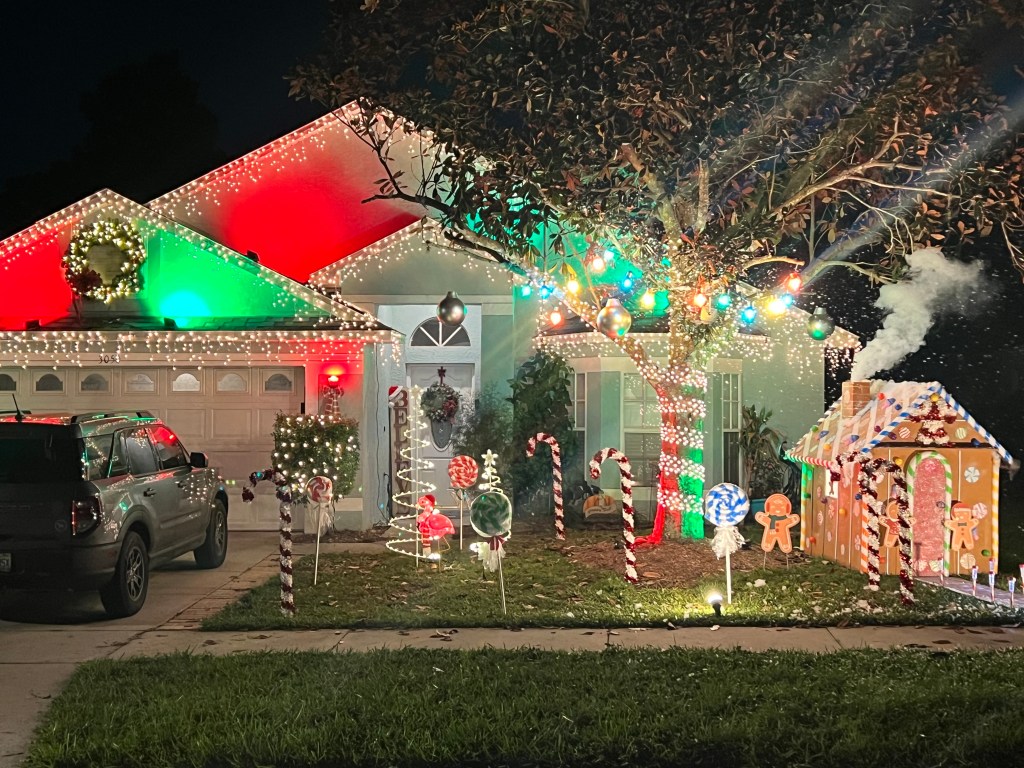 This picture was taken while moving with a line of cars behind us, so it doesn’t do the home justice. It is a full-property display with a roof blanketed in welcoming lights. There is a lovely forest of trees covering the front yard.
