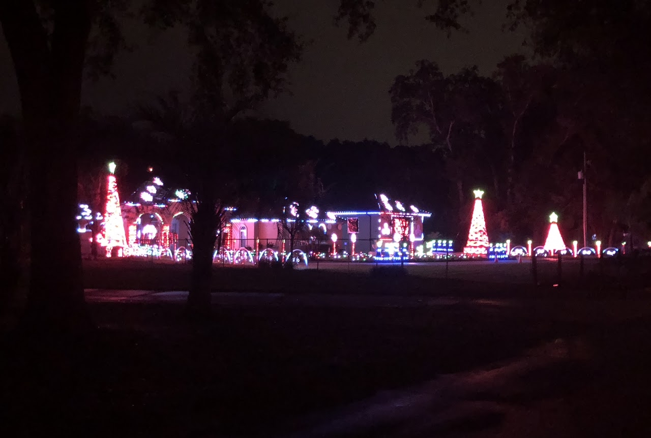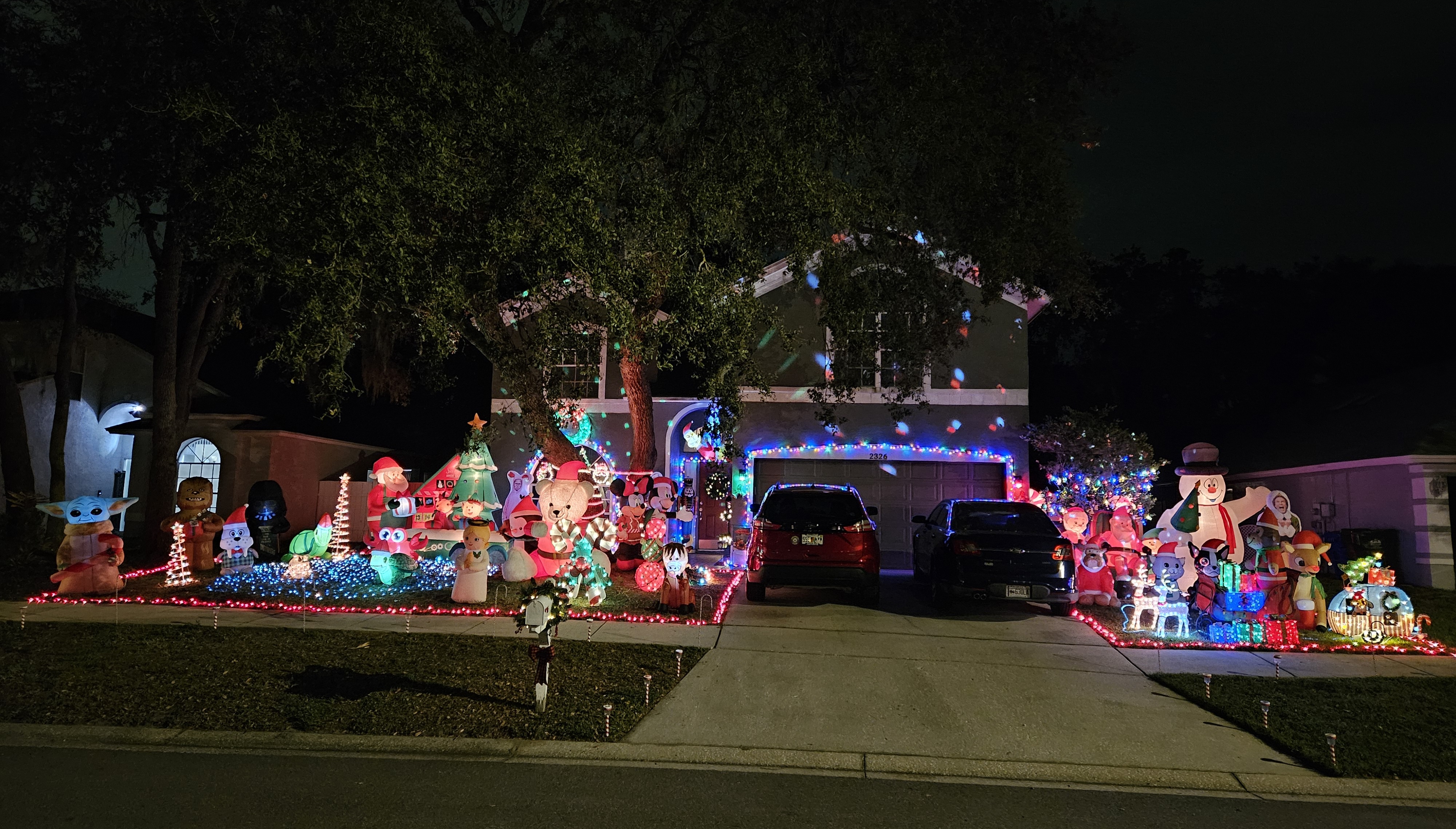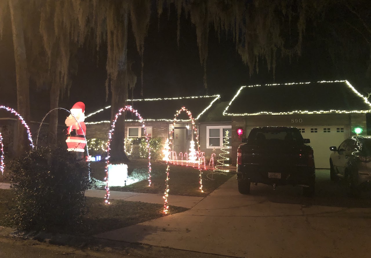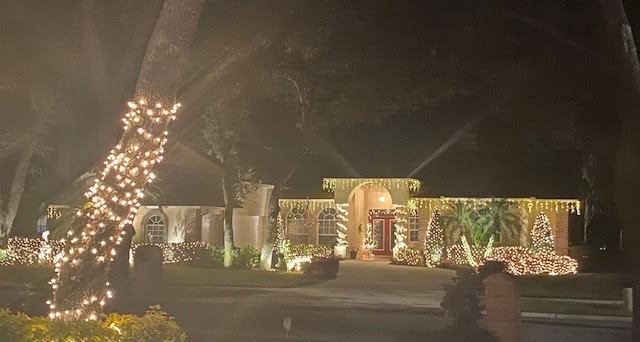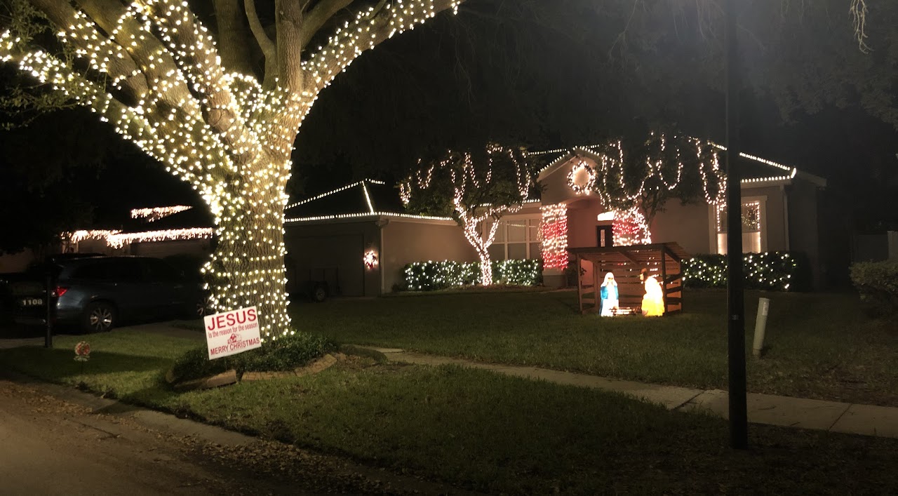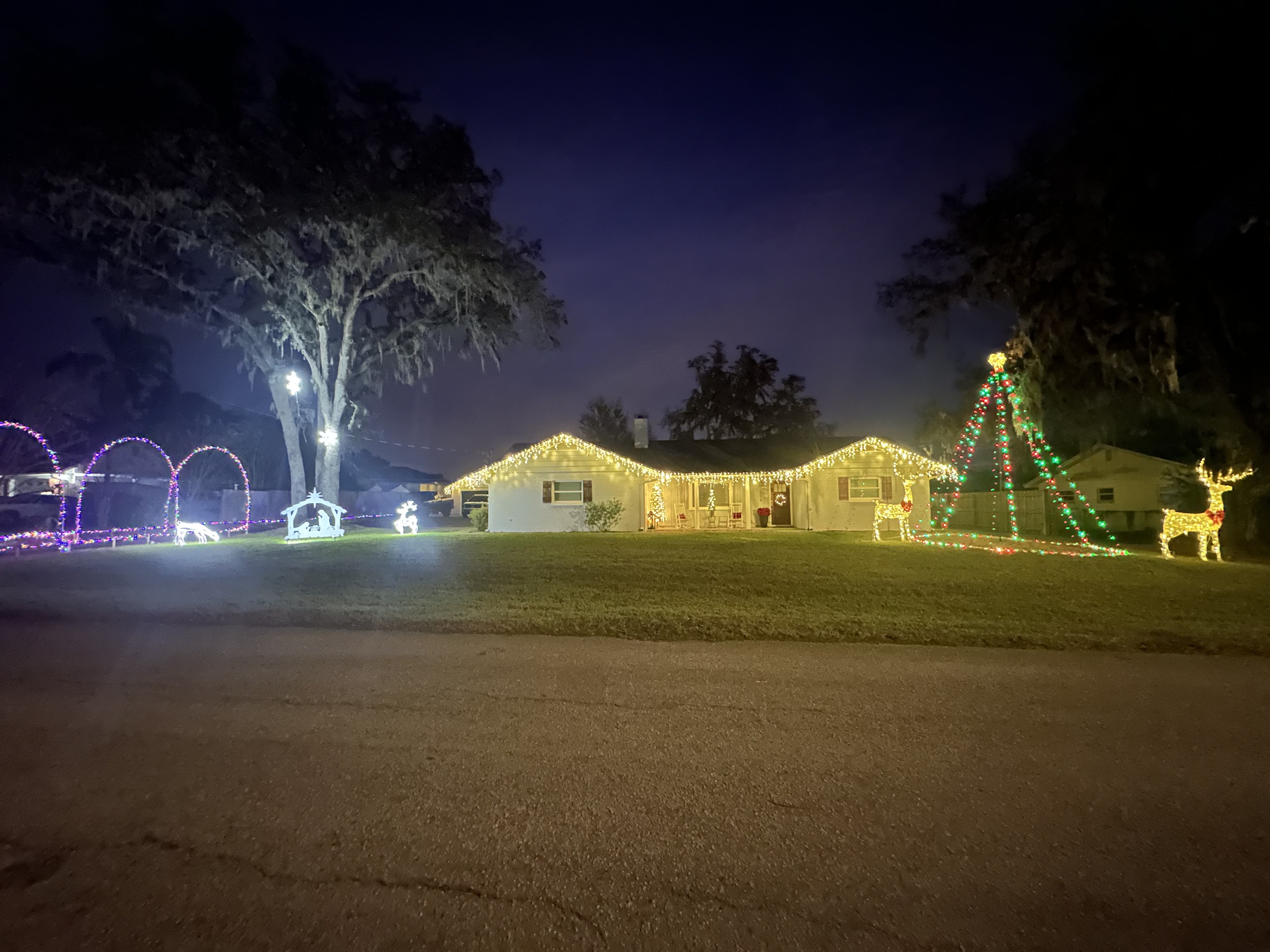 This picture was taken while moving with a line of cars behind us, so it doesn’t do the home justice. It is a full-property display with a roof blanketed in welcoming lights. There is a lovely forest of trees covering the front yard.