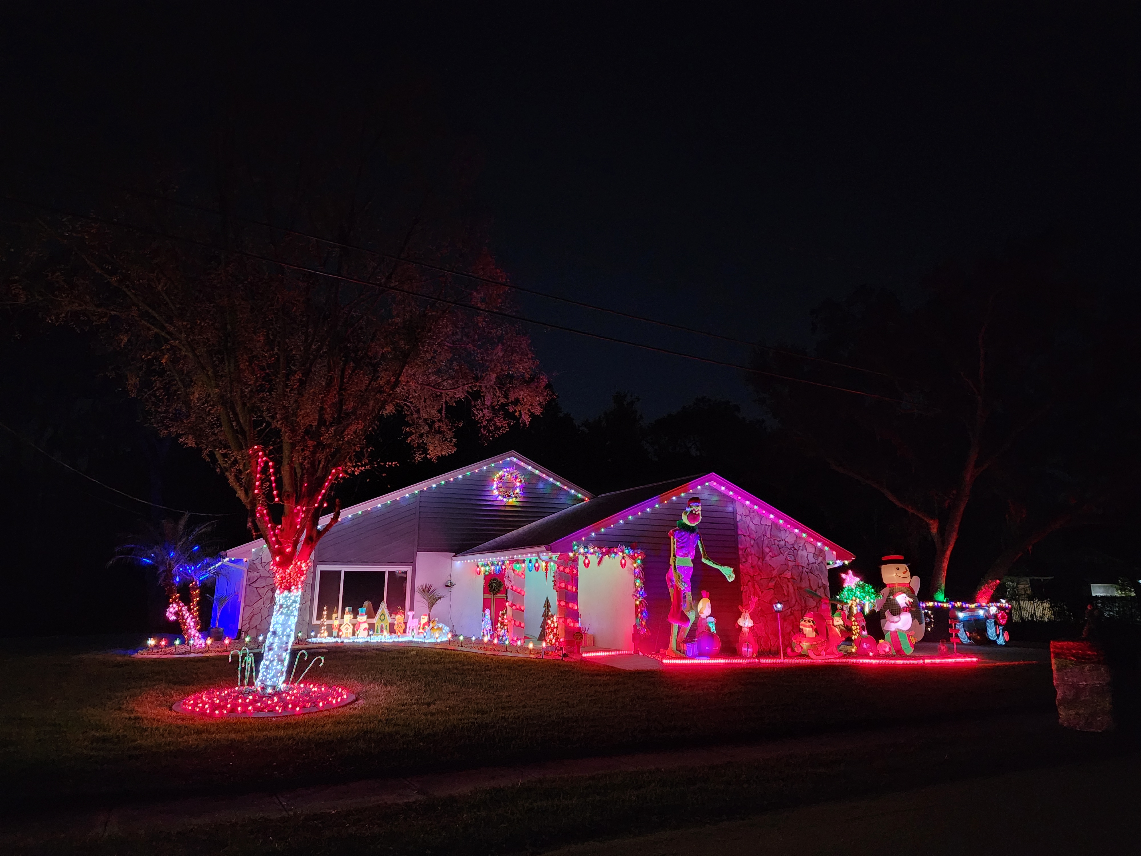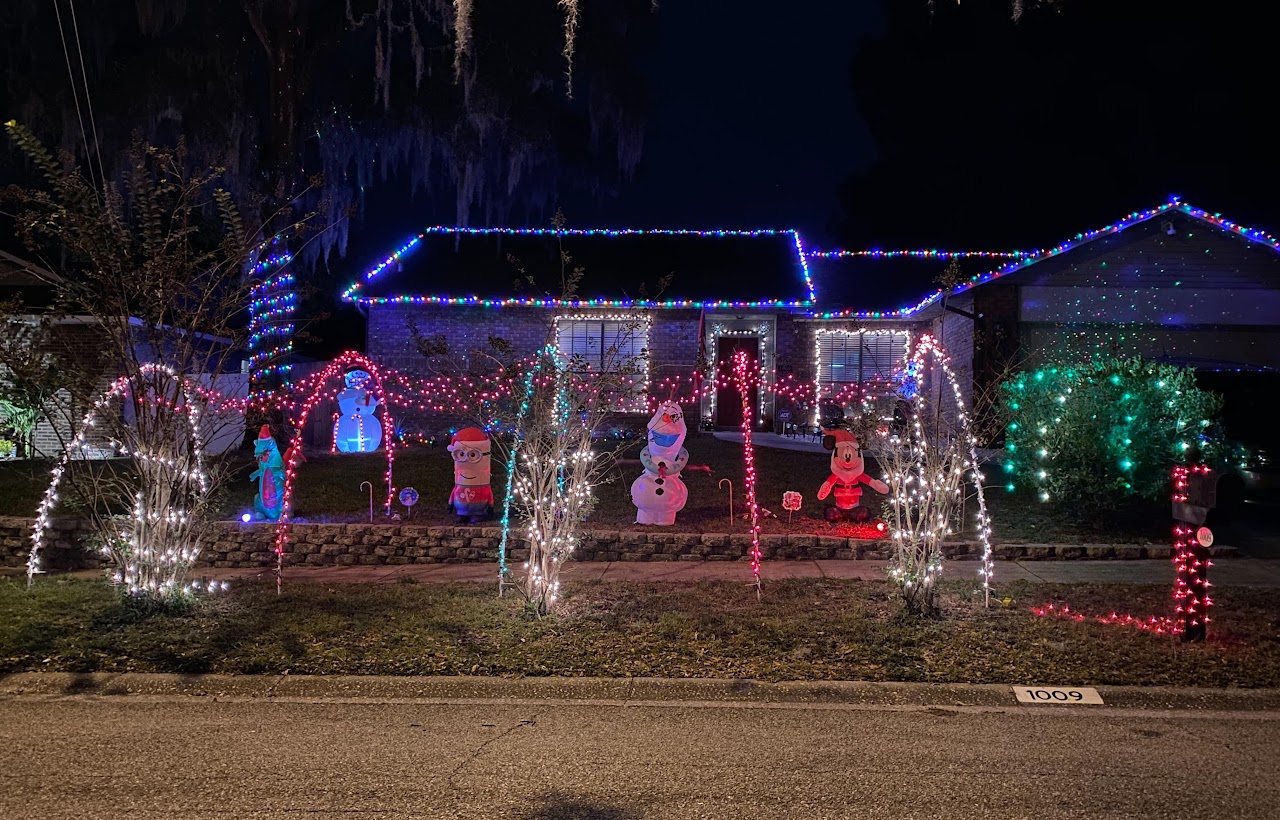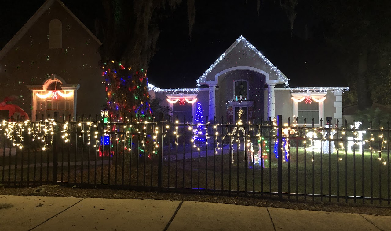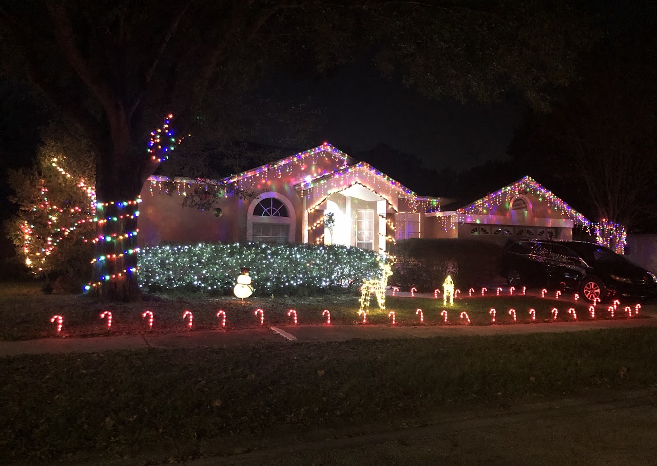 A fantastic spread of colorful lights that cover the property, and high up into the large tree canopy over the front yard. Lots of shimmering lights make this display radiant with just enough twinkle lights to make the whole display appear to sparkle.