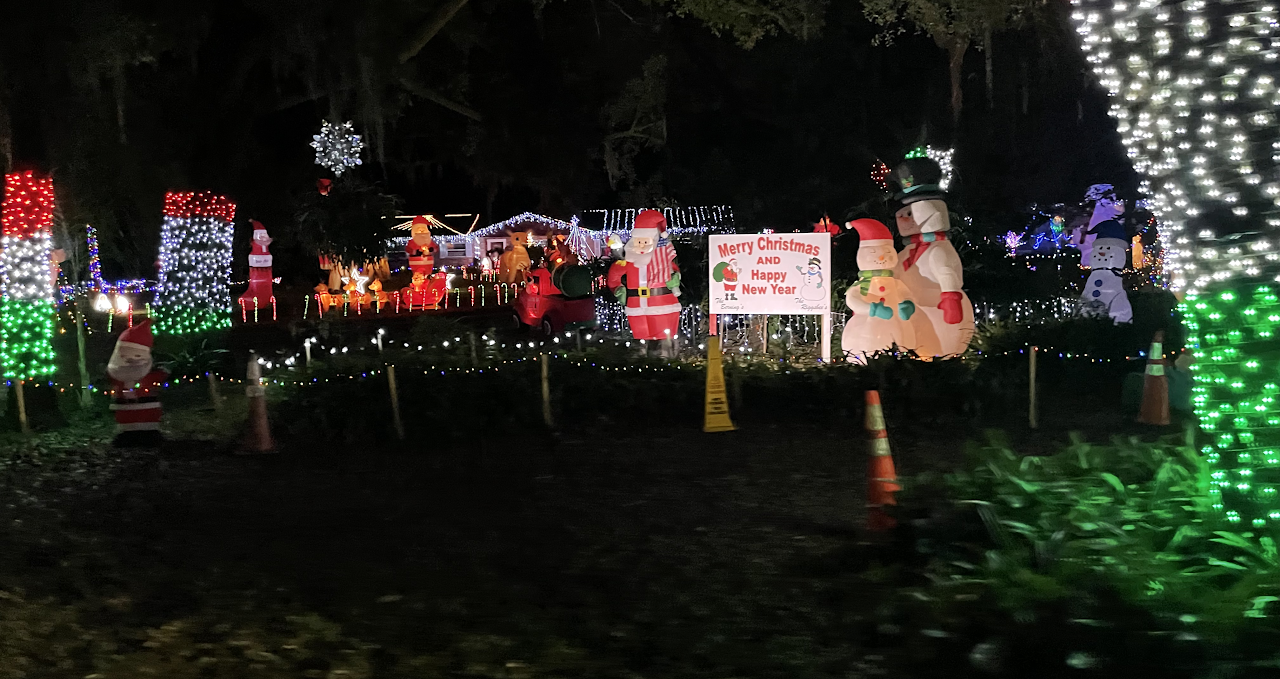 This whole street is full of Christmas spirit! There are a number of homes down this street who have gone all out decorating the homes and properties in colorful lights. From our understanding, most of these folks are family who have been there for 30-50 years and add to their cheerful display every year.