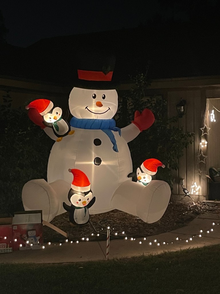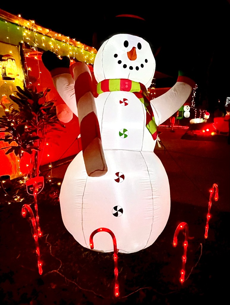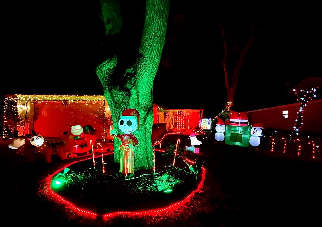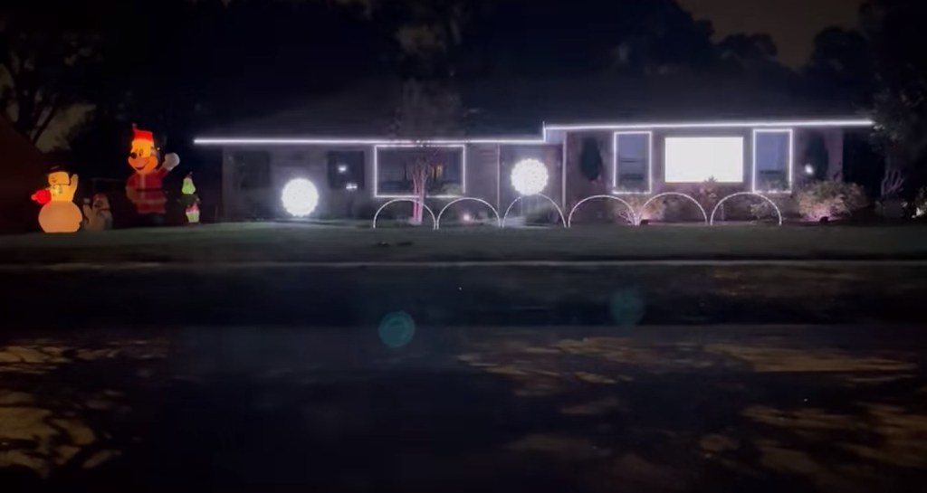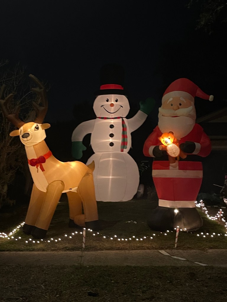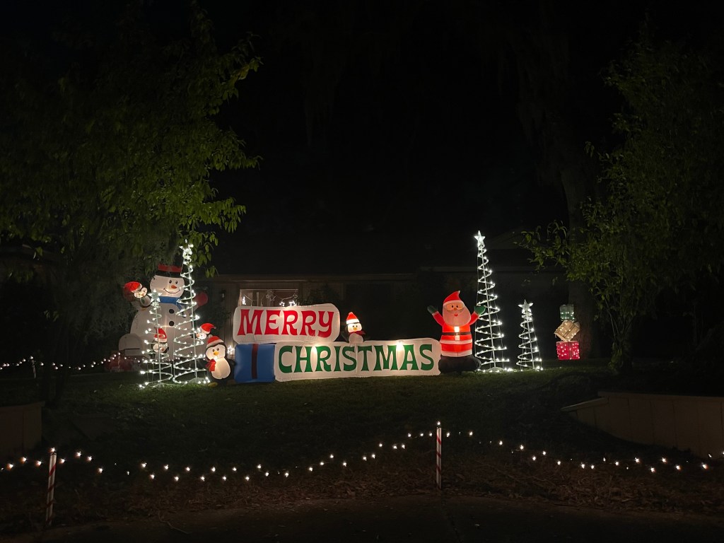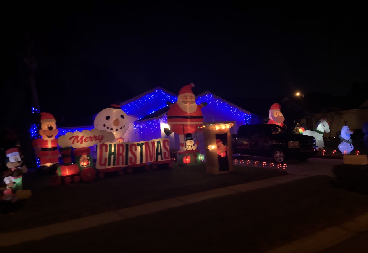 Elvis’ Blue Christmas seems to fit the bill for this fun display! The blue lights on the house make the inflatables shine even brighter. Our 4-year-old really enjoyed Mickey Mouse, Olaf, the train, and especially Santa peeking out from the out house!