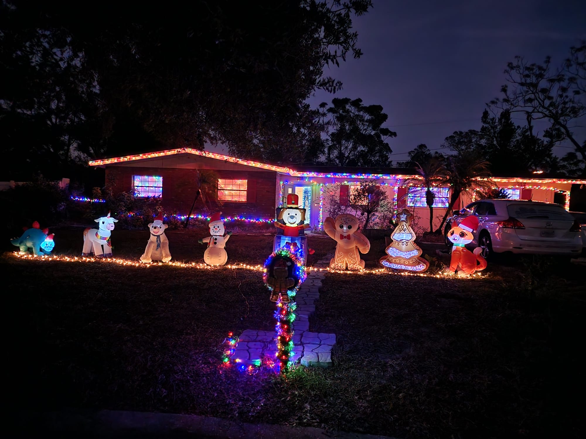 Roof lights, arch lights, window lights, along with outside base of lights. 8-10 blowups lined up with lights also mailbox lights. My kids love when people come by and slow down to see the decorations.