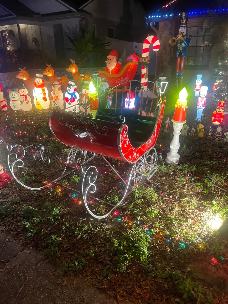 Full sized Santa sleigh. Swing by, climb in. Take pictures. All they ask is you watch your littles as they have lights everywhere, please don’t touch the decorations, and only two people in the sleigh at a time. They also have a letters to Santa mailbox next to the sleigh. Roughly 70 blow molds with more decorations added daily.
