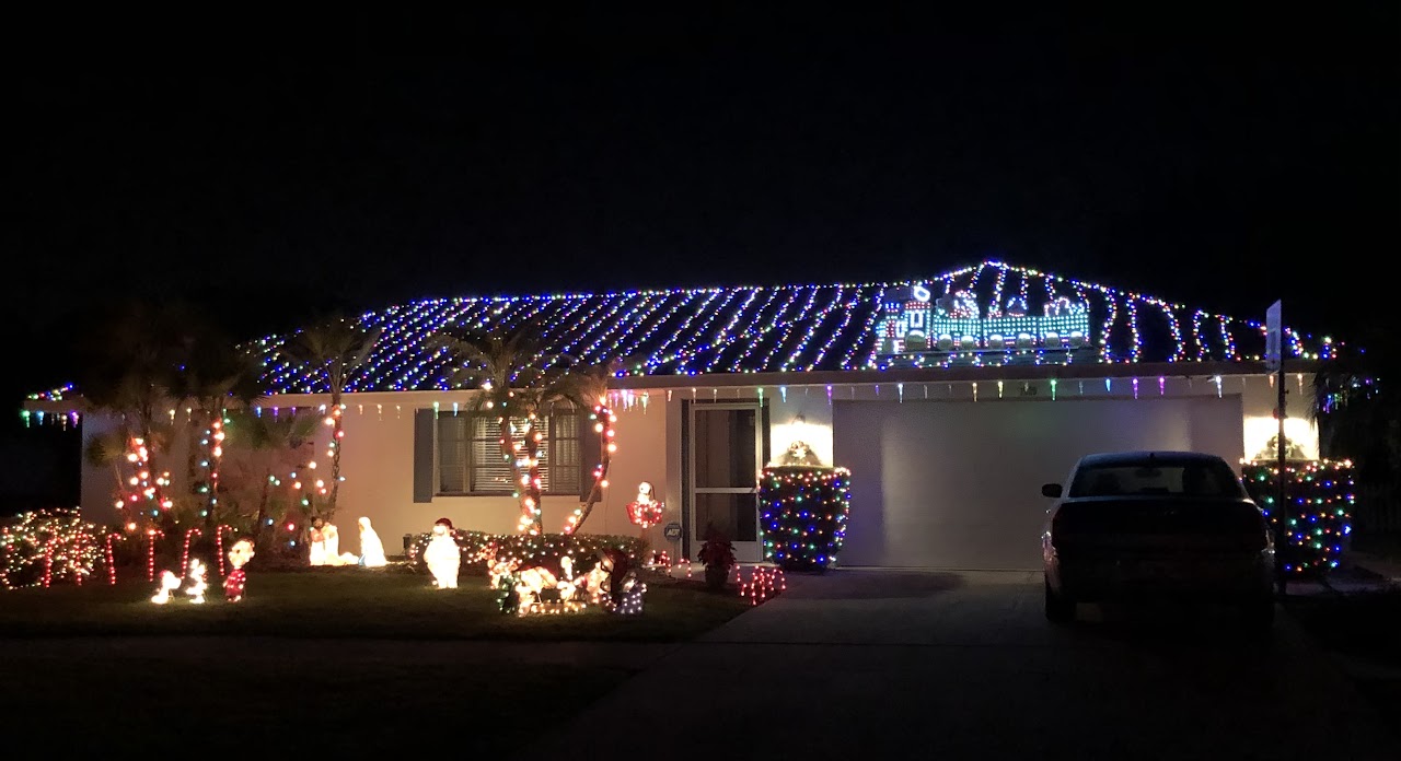 There are two really nice homes next to each other here. This one has a rood completely decked out in colored lights, with more colored lights all over the yard. Features a really cute train on the roof.
