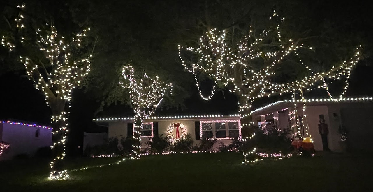 This home is on a nice corner lot with tons of incandescent-appearing colored lights covering the home, property and even the ground.