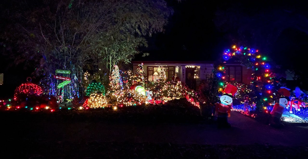 Great street with neighbors that appear to be in friendly competition for the biggest display. There are lots of lights, fully-decked trees and even Santa gracing us with his presence on one of the rooftops.