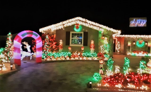 This is a must-see street. This was one of several really good homes. This one has tons of constant-on lights as well as several in the yard that are synchronized to music playing from the yard.