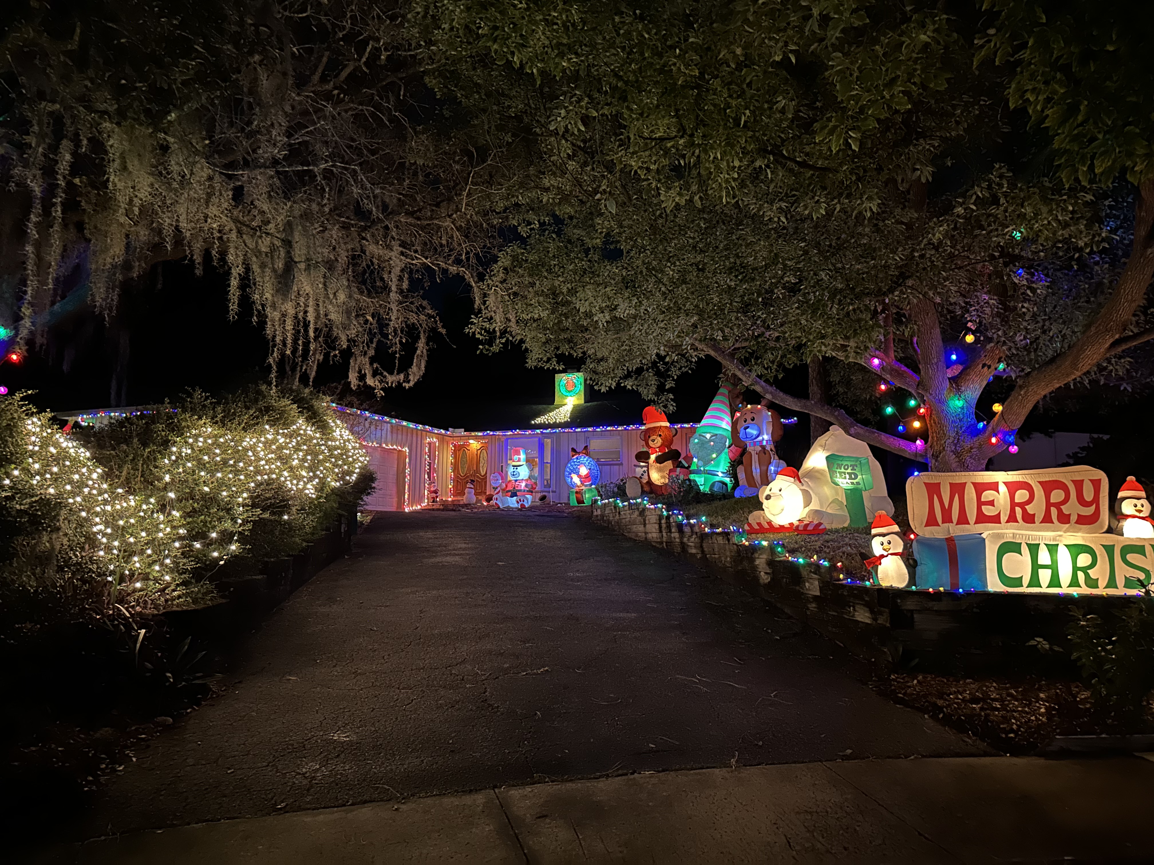 This whole neighborhood is great, and specifically this street. This home (and the one next to it) are brightly lit with cool white LEDs and are a wondrous site, especially with the perspective of the whole street in your view on the approach.